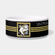 Het ontwerp is voorzien van een paar schaatsen op een sneeuwvlokcrest met zwarte en nepgoudglitterachtergrond. Dit elegante wintersportontwerp fungeert als een koele moderne en unieke dierenkom met gepersonaliseerde tekst.