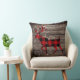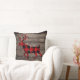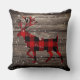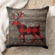 Een winter bos blokhut thema gooi kussen met een teruggewonnen hout schuur board achtergrond met een rode buffel geruite gepatroonde hert onder een lichte stof van sneeuw. De achterkant heeft een klein herhalingspatroon van hetzelfde grote podium.