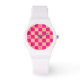 Geruite hete roze perzik geometrische retro met nummers Watch. Mode Accessoire Polshorloge cadeau voor haar. Koele retro geruit geometrisch vierkant patroon. tegel perzik en hete roze moderne checker.