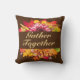 De Herfst/Thanksgiving met de thema's werpen kussen kenmerkt een Autumn waterverf geïllustreerd spleet van bladeren met gecentreerde "Gather Together" aanpasbare tekst op donkerbruine achtergrond.