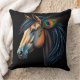 Digitale illustratie van een majestueus paard met een gedetailleerde manen en levendige pauwenveer tegen een zwarte achtergrond, met koninklijke elegantie en artistieke creativiteit.