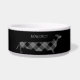 Persoonlijke hondenkom voor liefhebbers van worsthonden of mensen die stijlvol en een beetje apart zijn, met langwerpige dachshund in zwarte ruit op een zwarte achtergrond.