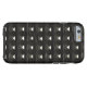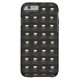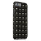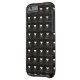 Gedrukt afbeelding van zwart leder met metalen deksels.
