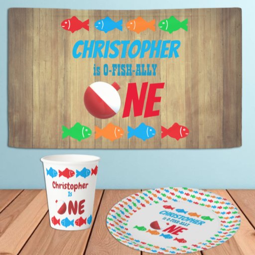 Vist cadeaus voor de eerste verjaardag met rode en blauwe vis en bobber van vissers
