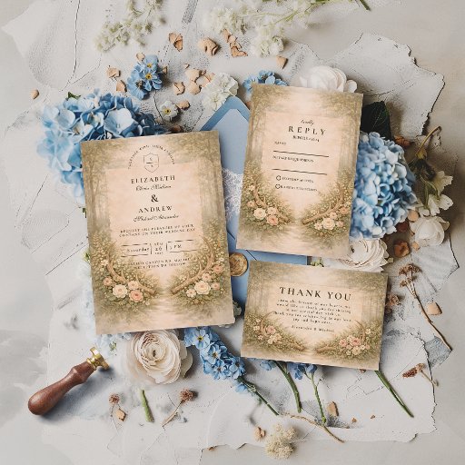 Een romantisch bosgeïnspireerd ontwerp met zachte neutrale bloemen, elegante geweien en een warme vintage perkament achtergrond. De compositie combineert organisch groen met verfijnde details voor een tijdloze boho-stijl die intiem, natuurlijk en stilletjes luxe aanvoelt—perfect voor koppels die aangetrokken worden tot klassieke romantiek met een rustieke, natuurgerichte touch.