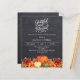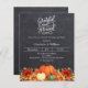Een faux rustieke krijtbord achtergrond. Versierd met pompoenen en oranje en gele bloemen. Personaliseer en voeg de partijgegevens toe. Tekstscript: Dankbaar en gezegend. 1 vel = 1 uitnodiging bedrukt rand tot rand.