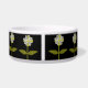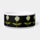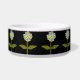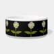 Deze geweldige dierenkom heeft een digitaal afbeelding van een madeliefje met een groene stengel met twee groene bladeren erop en wit- en geelgekleurde bloemblaadjes met een geel midden. De bloemblaadjes zien eruit alsof ze gloeien met een prachtige reflecterende kwaliteit. De bloem is op een zwarte achtergrond voor maximaal contrast en het resultaat is verbluffend.