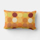 Lumbarkussen in een Mid-Century Moderne geometrische afdruk van reuzenstippen, in een raster van negen coördinerende kleuren - schaduwen van licht tot donker mosterdgoud, mahogany brown, tan en oranje, op een diepe mosterdgoud/saffraanachtergrond