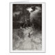 Uitzicht van een middeleeuws kasteel, met zijn dak verloren in de wolken van een stormachtige hemel. Kunstwerk van W.L. Taylor.