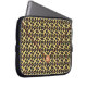 Het originele kunstwerk van ZoeSPEAK op deze 10" Laptop Sleeve is een patroon gemaakt in de stijl van een envelope clutch tas. De tas is een vergulde latticework kooi, bekleed met een donkerblauwe zwarte zijdeachtige stof die een subtiel patroon van ronde lijnen en hoogtepunten in blauw, rood en groen heeft. Er zijn kleine rode bolletjes in de open ruimtes van het latwerk. De flap van de envelop heeft een rode rand en een grote rode balknoopsluiting onder gouden latwerk.