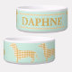 Schattigee crème gingham teckels omcirkelen deze munt hondenkom die is gepersonaliseerd met de naam van uw kleine worst hond in een klassieke serif lettertype op het midden van de kom. Pas het servies van uw hond aan uw boerderijkeuken aan. Dit klassieke patroon en kleurenschema is ook geweldig voor preppy pup ouders en cottage core esthetiek.