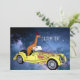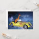 Grappig briefkaart met giraffe in een auto in de ruimte. Voeg uw aangepaste tekst toe.