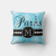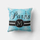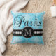 Deze zwarte en girale blauwe kussen gooien een kussen met een damaspatroon en personaliseerden je monogram initiaal, het woord "Parijs" met de Eiffeltoren en een lijn witte diamanten op een zwarte band zullen er geweldig uitzien in je slaapkamer of woonkamer als een accentuop. Monogram Galerij Gifts© Elke Clarke Design ©