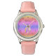 Dit is een schattig stijlvol ontwerp voor een meisje dat van eenhoorns houdt. Het horloge heeft een eenhoorn op de pastel regenboog faux glitter achtergrond. Het is gepersonaliseerd met naam in zwart trendy handgeschreven kalligrafie belettering over het bovenste gebied van het horloge gezicht. Klik op sjabloon personaliseren en volg de prompt.