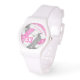 Dit coole meisjes volleybalhorloge heeft witte wijzerplaten en een roze, grijze en witte volleybalafbeelding waarop je haar naam en jersey-nummer kunt aanpassen - de roze en grijze volleybalpanelen zijn gemengd met een meisjesachtig bloemenkaleidoscopisch patroon - door katz_d_zynes