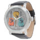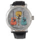 Polshorloge voor een gitaarspeler met een bijtend design. Grijze schuur achtergrond met drie akoestische gitaarachtige afbeeldingen in oranje, geel en blauw. De witte aantallen rond de rand en de bandselecties om aan te passen aangezien u wenst. Dit masculinaire horloge is de perfecte keuze voor elke muzikant of muziekliefhebber.