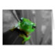 Glanzende groene kikker op een zwart-witte achtergrond die poseert voor de camera.