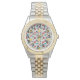 Dit vrouwenhorloge heeft een modern, midden-eeuwse vormgeving van een raster van zwarte lijnen met vierkanten en rechthoeken in retrokleuren op een gebied van wit.