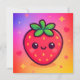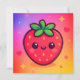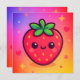 Dit schattige ontwerp is voorzien van een enkele cartoon-stijl aardbei met een vrolijk gezicht, roze wangen en expressieve ogen. De aardbei is bedekt met levendige groene bladeren en bezaaid met gele zaden, tegen een dromerige gradiëntachtergrond die overgaat van zacht roze naar paarse en gele. Verspreide harten, sterren en stippen voegen een grillige en speelse sfeer toe, waardoor de algehele compositie zoet en visueel heerlijk is.