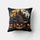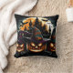 Drie gebeeldhouwde pompoenen met griezelige korrels schijnen helder tegen een schemerige hemel, omlijst door vleermuizen en een spookachtig kasteel badend in maanlicht.