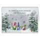On the front of this cute Holiday greeting card, a trio of brightly dressed little gnomes stand on their mountain top and sing "Oh, there's no place like GNOME for the Holidays". A forest of snow covered pine trees stands around them, snow continuto fall, and their musical notes drift off across the mountains. The inside has text fields for you to customize and personalize, and another image of a gnome audigling gold stars. Alleen!