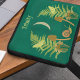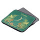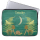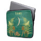 Mijn illustraties verbeelden een natuurlijke wereld met wat donkere ondertonen. Een halve maan hangt aan de hemel boven een tafereel van groene varens, gele motten, bruine paddenstoelen en een groene en bruine slak, allemaal geplaatst tegen een geschilderde donker blauwgroen gekleurde achtergrond. Deze laptophoes is klaar om te worden gepersonaliseerd met een naam of andere tekst in gele letters.