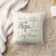 Kussen met troostend schriftvers uit Romeinen 15:13, "Moge de God van Hoop u vervullen met alle vreugde en vrede" in een hedendaagse typografische stijl met gedempte kleuren. Ontworpen ter nagedachtenis aan Kim.