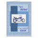 Een blauwe motorfiets op een abstracte blauwe achtergrond. Op het front staat: "Happy Birthday to my voortreffelijke godson". Een geweldige kaart voor een peetzoon die een motorfiets enthousiast is. De texturen op de voorzijde van deze kaart zijn gedrukt.
