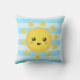 Een zon met kawaii-expressies die helder op een blauwgroene strepen patroonachtergrond schijnt. Dit schattige en vrolijke ontwerp is zeker om iedereen te glimlachen.