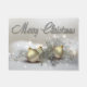 Prachtige gouden kerstboomversieringen op een metalen zilverachtergrond met gouden wimpels en linten en sneeuwwitdentakken om hen heen. Met de kniplichten wordt het woord 'Merry Kerstmis' gemarkeerd in een ruitvormige snijfont met gouden contouren.