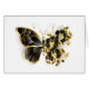 Goudbloemvlinder met zwarte juwelen, versierd met goudbladeren op witte achtergrond.