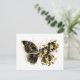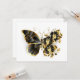 Goudbloemvlinder met zwarte juwelen, versierd met goudbladeren op witte achtergrond.