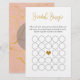Dit girale vrijgezellenfeest spel Bridal Bingo zal geliefd zijn bij de meeste bruidjes. Het romantische ontwerp is voorzien van gouden letters en een roeskleurige marmer aan de achterkant van de roman. U kunt de achterzijde van de kaart personaliseren met de naam van de toekomstige bruid en de datum van het vrijgezellenfeest. Voeg uw douanetekst aan dit ontwerp toe door de "Edit this design sjabloon"vakjes op de rechterkant van het punt te gebruiken, of klik de "Customize het"knoop om de tekst te schikken, de doopvonten, de doopvontkleur en de achtergrondkleur te veranderen.