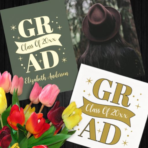Gold and white graduation with class year inside a banner ribbon and decorative star accent.