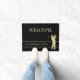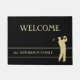 Een gouden silhouette golfer neemt een volle zwaai aan de rechterkant van deze golfthema deurmat. Thin gold lines lijst uw familienaam of andere douanetekst in het passende goud, en het hoogste tekstgebied, dat ook klantgericht is, zegt momenteel WELCOME. Het afbeelding en de tekst worden geplaatst op een zwarte achtergrond, maar u kunt de achtergrondkleur veranderen door te kiezen past het aan.