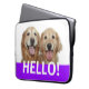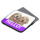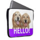Zeg Hallo! Deze laptophoes is voorzien van een foto van twee lachende gouden hondenhonden, met het woord HALLO! op een paarse achtergrond.