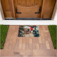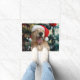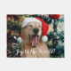 Welkom gasten in uw huis dit vakantieseizoen met deze schattige deurmat! Design heeft een foto van een gelukkige golden retriever hond die een kerstmuts draagt voor een kerstboom. Tekst zegt: "Vreugde aan de wereld."