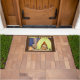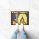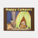 Deze deurmat is voorzien van gouden terugwinnaars in een kampeerplaats. Een gouden opvrager gooit marshmallows door het kampvuur, terwijl de andere in de tent hangt. De boodschap luidt: "Happy Campers".