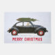 Golden rekwieg reed een retro zwarte auto in sneeuwvlokken met groene kerstboom op het dak.