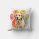 Levendige spatten van kleur omringen een vrolijke golden retriever, elk lijkt op een pootafdruk in tinten van rood, blauw, sinaasappel en geel op een witte achtergrond