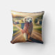 Een golden retriever loopt over een onverharde weg met een Amerikaanse vlag in zijn mond, terwijl de zon ondergaat boven een schilderachtig landelijk landschap