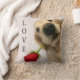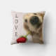 Voeg een beetje gouden geluk toe aan je huis! Deze gooiende kussen bevatten een foto van een schattige gouden hondenhond die een enkele rode roos in zijn mond houdt. De tekst luidt: "Liefde", maar deze kan worden verwijderd of aangepast aan uw behoeften. Ideaal voor Valentijnsdag, of om het even welke dag!
