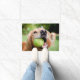 Een close-upshot van een Golden Retriever met een gele tennisbal in haar mond.