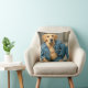 Een golden retriever hond is gekleed in een stijlvolle denim jas en gescheurde spijkerbroek, luieren terloops op een kussen tegen een wazige achtergrond