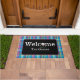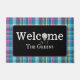 Verhoog uw entree met onze betoverende turquoise en paarse plaid gepersonaliseerde welkomstmat, met een leuke golfbal op een lavendel t-shirt ter vervanging van de O in Welcome. Verkleed je entree met een welkomstmat met golfthema. Het perfecte cadeau voor de fanatieke golfer, of 19e hole golfbaan clubhuis.