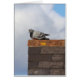Een foto van een duif die op de top van een dak op een zonnige winterdag doortrok.