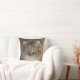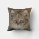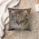 Een prachtige, rechte foto van een wazige, groenogige kat op een kussen met worp. De foto staat aan beide kanten. Ideaal voor kattenliefhebbers.
