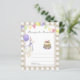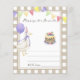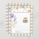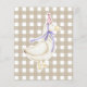GEKKE GANS. Waterverf kinderen verjaardagsfeestje. Waterverf schattige gans in verjaardagstaart, pet met bessen, paarse ballon, feestelijke vlaggenslinger. Beige-bruine kooi achtergrond.