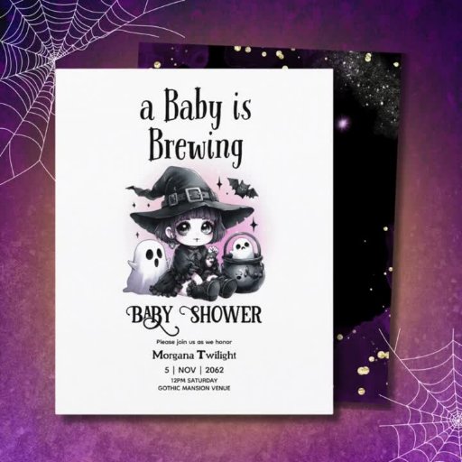 Super schattig en leuk Gothic baby shower event item. Uitzicht het volledige collectie voor overeenkomende objecten. Paarse en zwarte kleur thema. Inbegrepen in de set zijn Baby is brouwen, kleine boo op de weg, uitnodigingen, luier loterijkaarten, gunstboxen, goody tassen, borden, stickers, tshirts, bedankjes en meer. De thema's zijn: heksen, geesten, vleermuizen, kraaien, ghouls, genderneutraal en baby jongen en meisje thema. Veel om uit te kiezen!