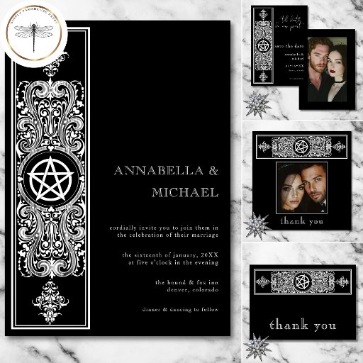 Vier je eeuwige liefde met een huwelijksuitnodiging die net zo gedurfd en onvergetelijk is als je band. Met een opvallende zwarte achtergrond, een gotische witte rand en een stermotief van een pentagram zet dit ontwerp de toon voor een nacht vol romance en mysterie. Perfect voor koppels die de schoonheid van het donker en de diepte van ware toewijding durven te omarmen. Creëer door Simply Farmhouse Press.